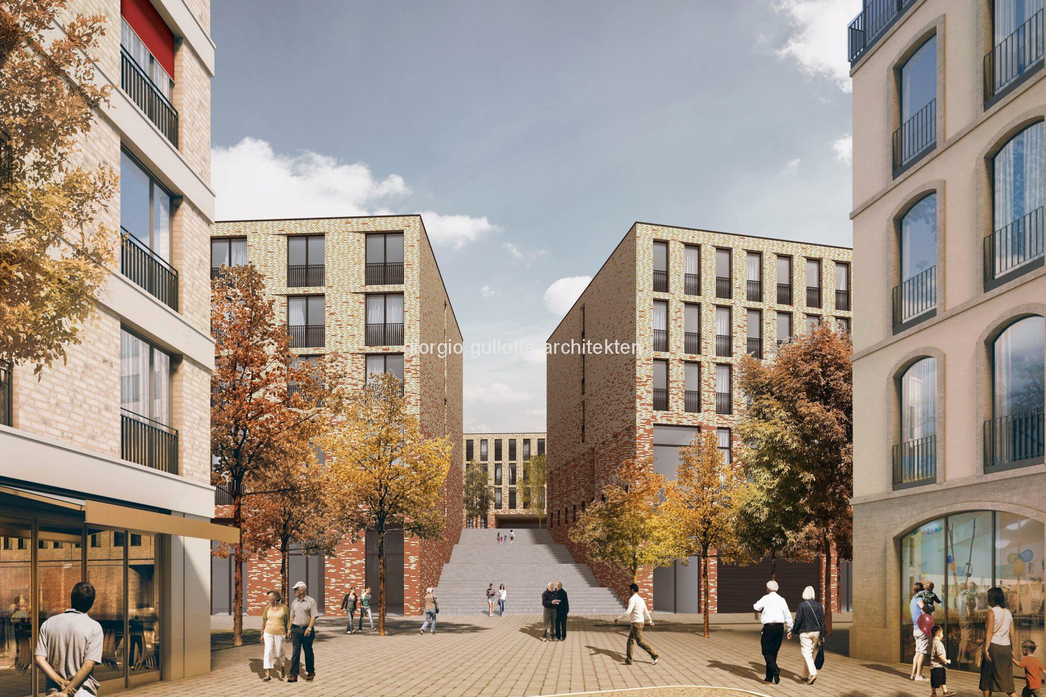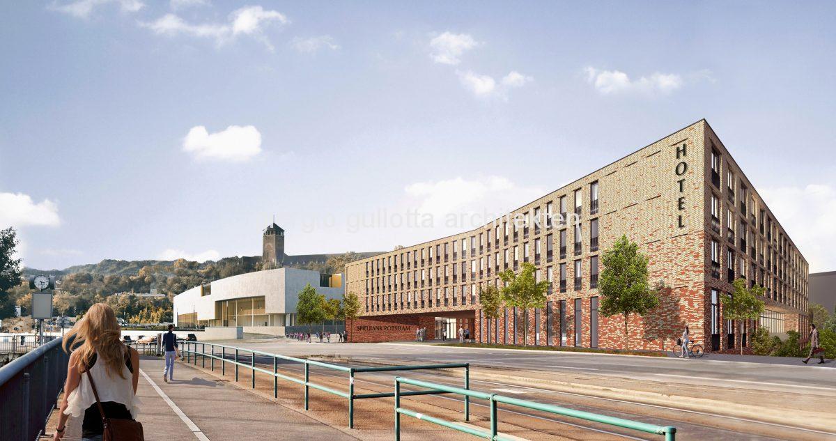 Der Entwurf des Hotel- und Dienstleistungsgebäudes, welches sich im nördlichen Teil der Speicherstadt zwischen dem neu geplanten Quartier Expert`s Neighborhood und dem Sport- und Freizeitbad Blue vis-à-vis des Bahnhofs direkt an der Langen Brücke befindet, bildet das Entree sowohl in das Quartier Expert´s Neighborhood als auch in die Potsdamer Innenstadt. Um dem städtebaulichen Baustein gerecht zu werden, reagiert der Baukörper sowohl auf die komplexe Topographie des Grundstücks, als auch auf die verschiedenen Nutzungen. Die unterschiedlichen Nutzungen von Spielbank, Hotel und Gewerbe zeichnen sich in der Fassade durch Vor- und Rücksprünge differenziert ab, ohne den Baukörper zu zergliedern. Die Farbgebung der Fassade orientiert sich an dem für Potsdam typischen Farbspiel von naturroten bis gelbockerfarbenen Naturtönen. Die Fassade in klassischen Ziegelmauerwerk nimmt die Charakteristik der Umgebungsbauten spielerisch und gleichzeitig vermittelnd auf. Aufgrund der besonderen Topographie, die das Bauwerk als vermittelnder Baustein zwischen Expert´s Neighborhoods und der Heinrich-Mann-Allee hat, ist ein frei komponiertes Farbspiel in der Fassade gewählt, das vom Sockel beginnend mit naturroten Ziegeln nach oben auflösend durch Einstreuung von gelbockerfarbenen Ziegeln nach oben hin sich als monochrome gelbockerfarbenen Fassade darstellt. Die Spielbank schiebt sich als naturrote homogene Einheit in den Baukörper, ohne das Farbspiel der Fassade zu stören, gleichzeitig wird die besondere Nutzung der Spielbank Potsdam nach außen klar ablesbar. Die Diskretion wird durch horizontale Ziegelbänder, die vor den Fenstern wie ein seichter Schleier vorbeiläuft, gewahrt. Die Struktur ermöglicht ein wundervolles Spiel aus Licht und Schatten im Inneren der Spielbank. Zu Nachtzeiten kehrt sich das Spiel des Lichtes um
