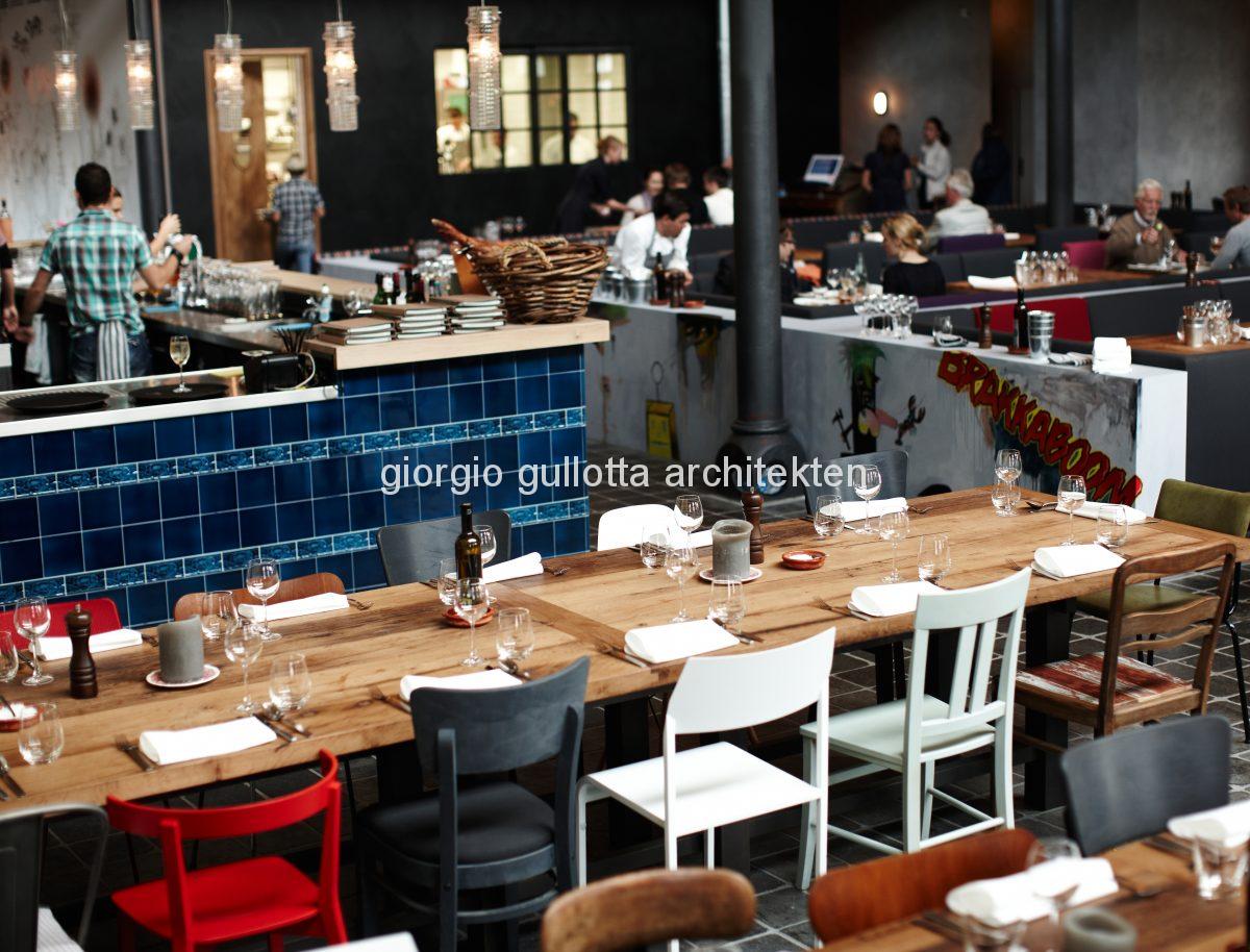 Inmitten des Schanzenviertels befinden sich die historischen Viehhallen. Diese dienten bis in die 50er Jahre des vergangenen Jahrhunderts der Einfuhr und dem Versand, sowie dem Handel mit Kälbern und Versandschweinen. Die ehemaligen Viehhallen wurden revitalisiert und modernisiert. Im Kopfbau und Teilen der westlichen Halle befindet sich die Bullerei mit Deli und Tagesbar. Der Hallencharakter bleibt aufgrund der Gruppierung der einzelnen Funktionsflächen erhalten. Die Küche präsentiert sich als Herzstück der Fläche. Eine Vitrine mit aufgehängten Kalbshaxen und Schweinehälften lässt den Gast am Geschehen in der Küche teilhaben. Vor dem denkmalgeschützten Kopfbau befindet sich die Außengastrofläche des Delis. Natursteinböden und unverputzte Wände erhalten den Charme der historischen Viehversandhallen. Der getrommelte Blausteinboden scheint schon seit 100 Jahren als Bodenbelag in den Hallen zu liegen. Das Wechselspiel zwischen der historischen Struktur und der neuen Architektur bestimmt die Atmosphäre der Bullerei. Bewusst wurden Designklassiker mit einfachen Objekten gemischt. Gleiches gilt für die Möbel. Die Esstische aus alter Eiche werden von modernen Graffitis eingerahmt. Eine Vielzahl der Leuchten sind Sonderanfertigungen, die auf das Konzept abgestimmt wurden. Durch die Wiederbelebung und Nutzungsänderung der brachliegenden, kurz vor dem Abriss stehenden historischen Hallen, erhält das umliegende Viertel insgesamt eine Belebung und Aufwertung.