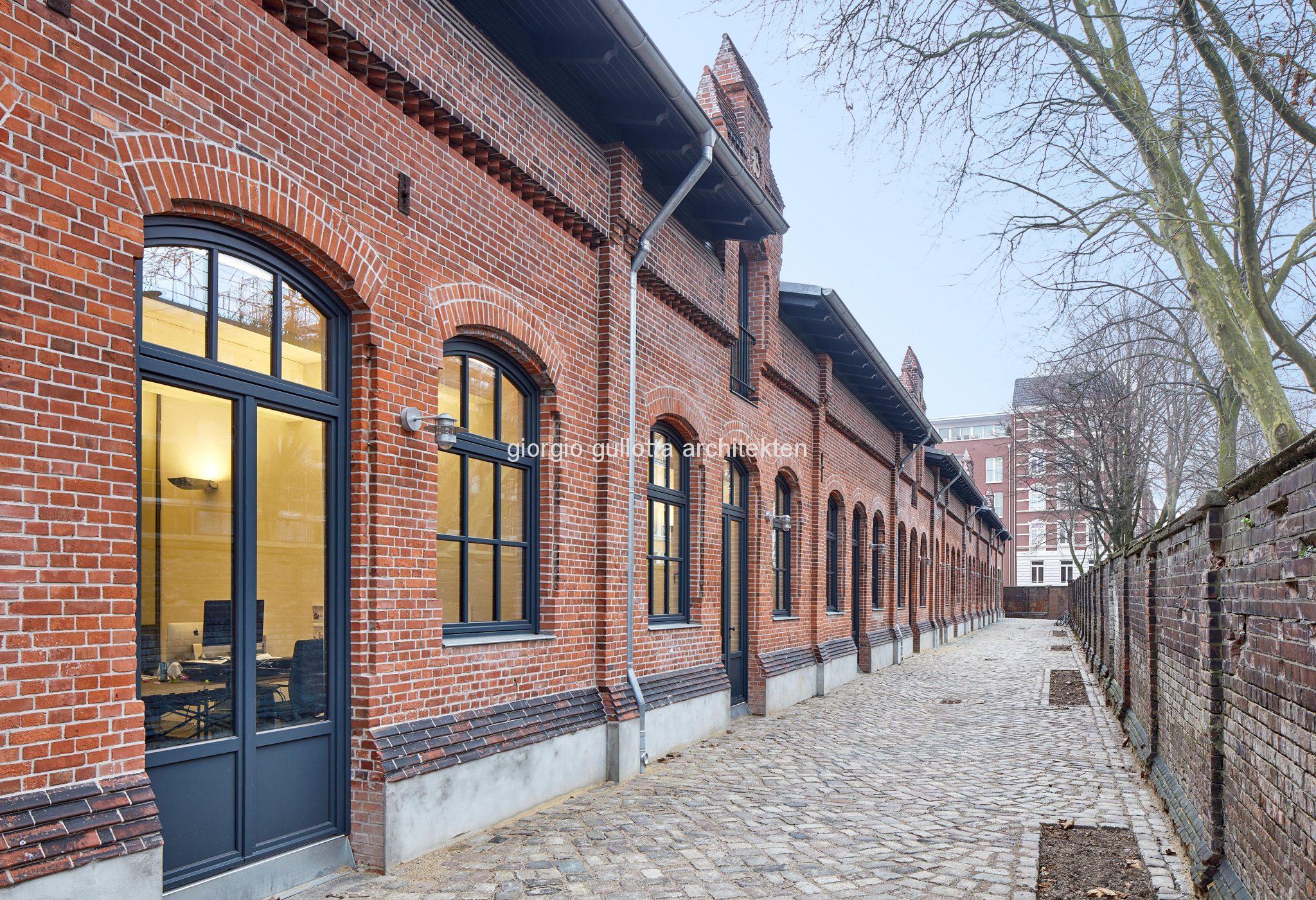Angrenzend an den heutigen Fleischgroßmarkt Hamburg befindet sich der historische Contumazstall. Ursprünglich diente der rund 90 m lange Stall von 1890 als Quarantänestation für Rinder, wurde die letzten Jahrzehnte aber lediglich als Lager- und Abstellfläche genutzt. Er gehört zu den wenigen erhaltenen Gebäuden des ursprünglichen Fleischgrossmarktes. In dieser Zeit erlebte das Bauwerk einen dramatischen Zerfall der Substanz. Zudem wurde durch nicht vorhandenen Respekt des Bauwerks gegenüber, mit brachialer Ignoranz am historischen Stall rumgebastelt. Fensteröffnungen wurden zugemauert, Dachrinnen abgerissen, neue Öffnungen eingeschnitten etc. Der Zustand war so schlecht, dass die Freie und Hansestadt Hamburg das Gebäude zum Abriss freigegeben hat. Durch das Engagement der Architekten, das Gebäude zu retten, konnte letztendlich ein Bauherr gefunden werden, der sich für den Erhalt des Contumazstalls begeistern lassen konnte. Heute präsentiert sich das historische Bauwerk als modernes, offenes und einmaliges Bürogebäude mitten im lebendigen Stadtteil Schanze. Im Zuge der Revitalisierung und Umnutzung der einzelnen Ställe zu Büroflächen wird der Charakter des denkmalgeschützten Gebäudes wieder herausgearbeitet. Durch liebevolle Details und für den Betrachter nicht erkennbare Veränderungen wird der Stall zu einem in sich stimmigen Bauwerk transformiert. Zu der umfangreichen Sanierung gehörten der Erhalt und die Rekonstruktion der historischen Ziegel Fassade. So wurden u.a. 14.000 Mauersteine in der Fassadenfläche ausgetauscht, die teilweise zerstörten Zwerggiebel erneuert, sowie der Westgiebel nach historischem Vorbild neu aufgebaut. Das stark beschädigte Dach mit seinem historischen Dachstuhl wurde ebenfalls aufwendig rekonstruiert, ergänzt und raffiniert umgebaut, sowie mit großen Oberlichtern ergänzt. Um der neuen Nutzung gerecht zu werden und das übertiefe Erdgeschoss zu belichten und zu belüften, wurden große Lichthöfe in die neu eingebrachte Brettstapeldecke eingeschnitten. Die großen Oberlichtfelder belichten somit die Mittelzone des Erdgeschosses. Die Materialwahl des Fußbodens unterstreicht den industriellen Loft-Charakter. Es wurde ein Industrie-Estrich eingebracht, der im Bereich der historischen Mauerschotten jeweils durch handgemachte Kaolin-Fliesen strukturiert wird. Zudem bildet sich somit die historische Struktur vollständig im Ausbau ab. Die Bürozellen sind durch – vom Architekten entworfene – Glas-Elemente zur Mittelzone abgegrenzt. Hierbei war es besonders wichtig, dass die Verarbeitung in Anlehnung an historische Stahlkonstruktionen ausgeführt wurde. Das im Zuge des Umbaus gefundene historische Großpflaster der alten Außenanlage konnte ausgebaut werden und wurde auf der Südseite nach Fertigstellung wieder neu verlegt und unterstreicht somit die harmonische Gesamtanmutung.